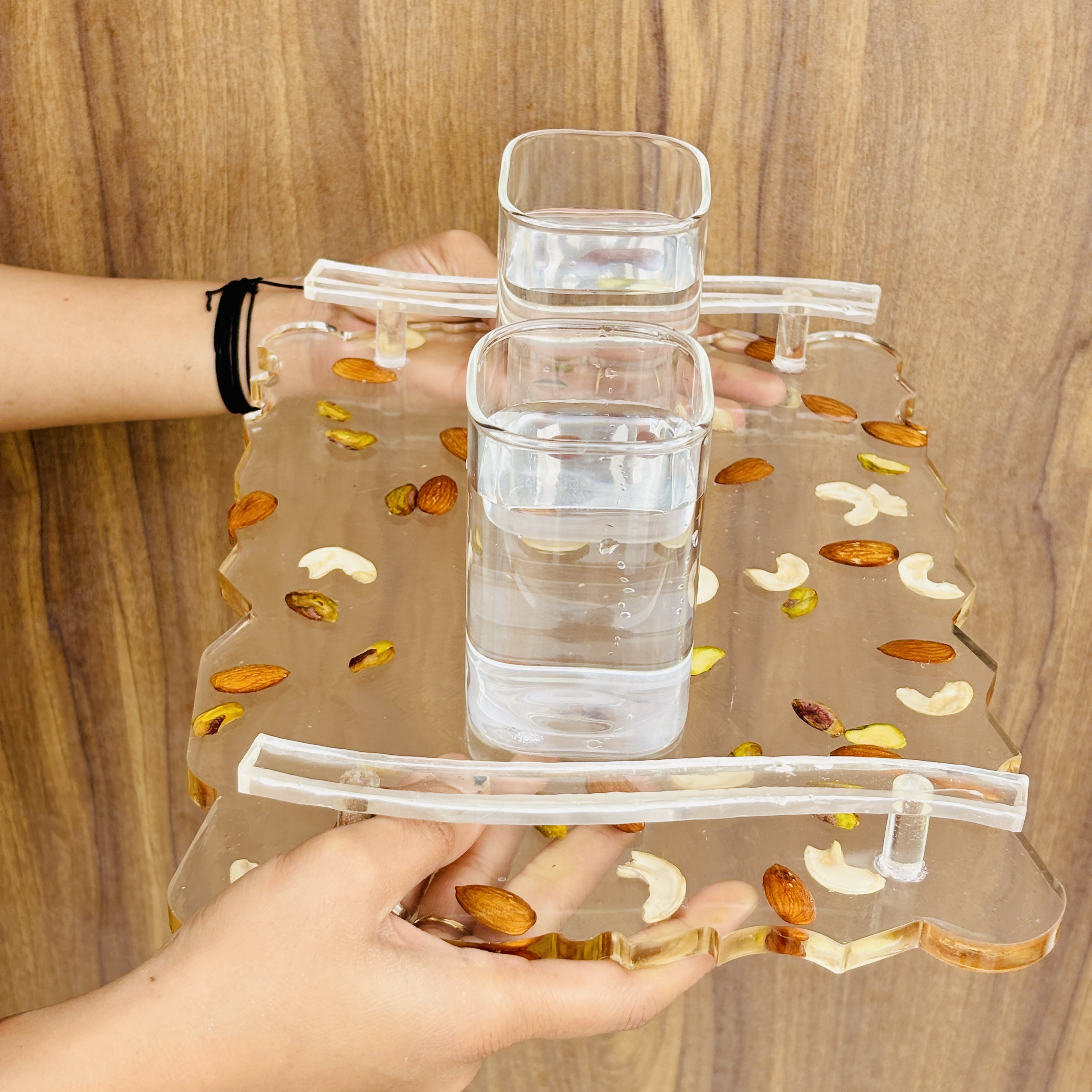 Handcrafted Resin Tray with Real Dry Fruits – Beautiful handmade tray crafted with real almonds, cashews, and pistachios sealed inside premium quality resin for an elegant and natural look.