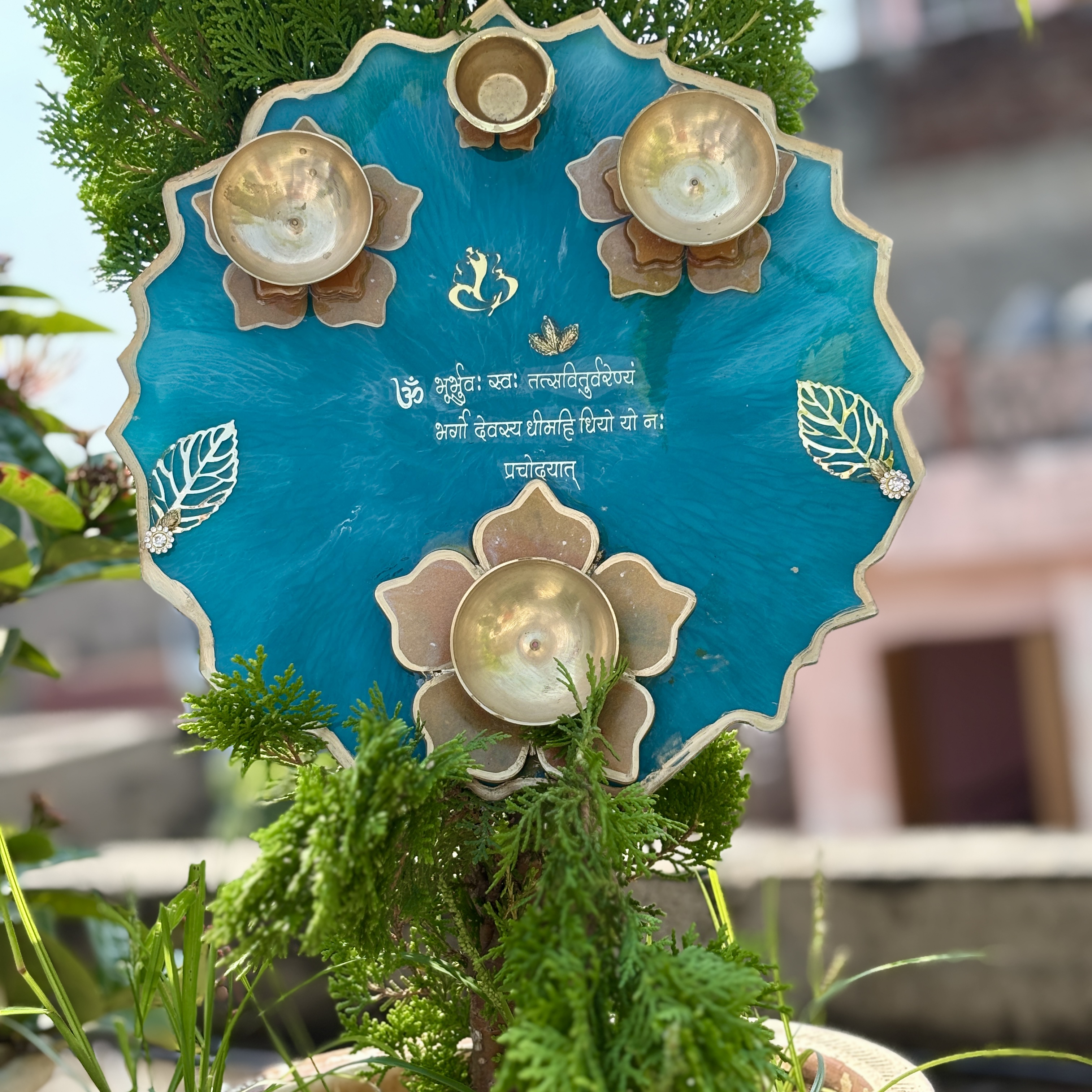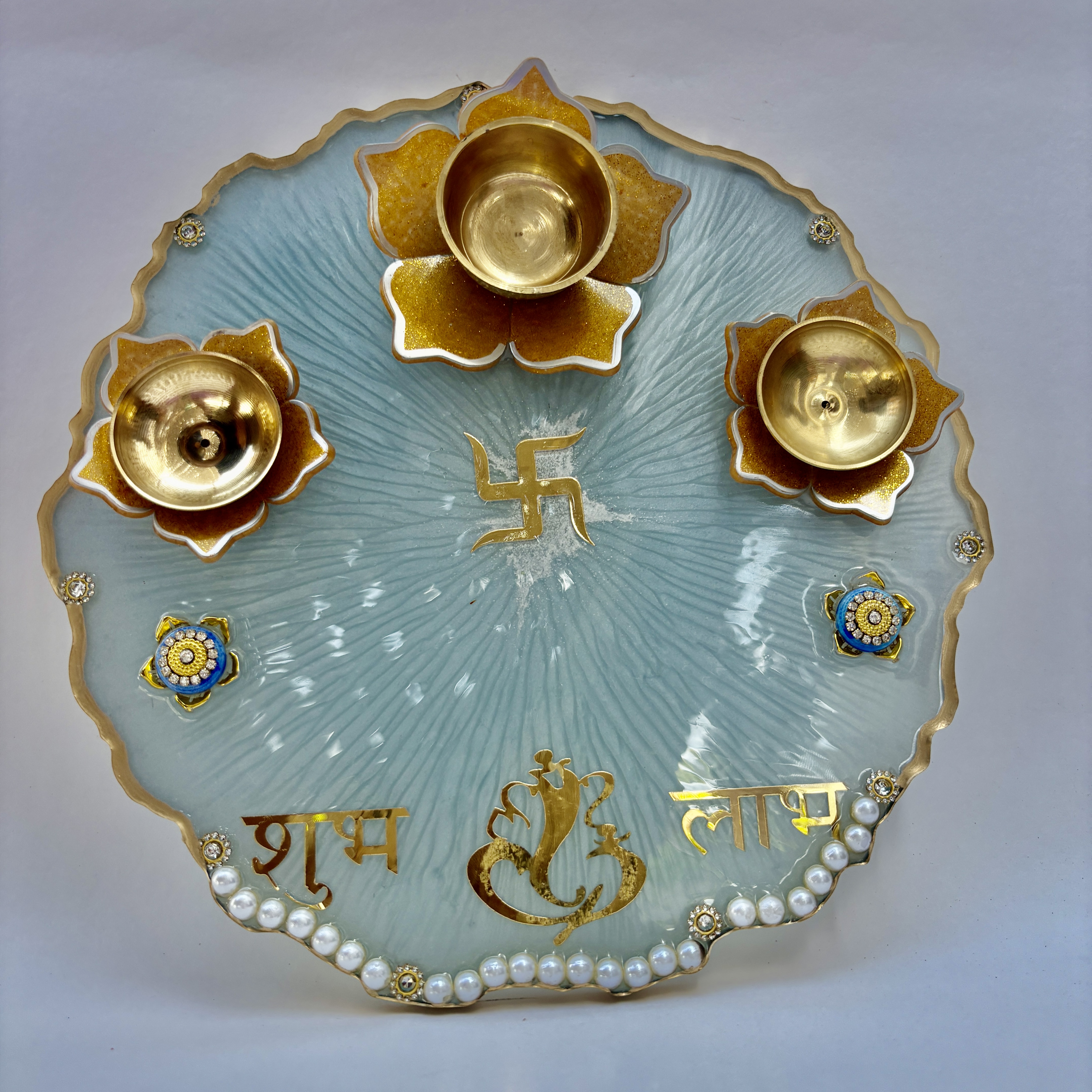 Handcrafted Resin Pooja Thali – 10 Inch Size: Beautifully handmade resin thali with elegant blue color & traditional design — perfect for Diwali, Laxmi Puja, or home temple decor.